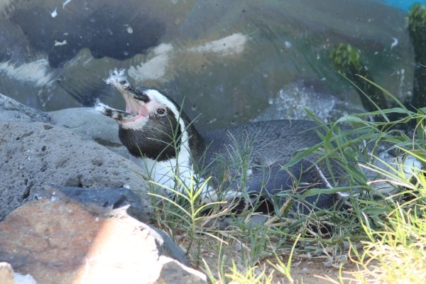 「どないしょーこれ」クチバシにくっついたふわふわの羽毛に、実際には困ってなくても、困り顔に見えるフンボルト。換羽がほぼ終わって残った羽をクチバシでかいたらこうなってしまいました。越前松島水族館。