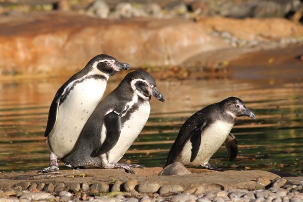 ロンドン動物園のフンボルト、自然景観ふうのプールサイドをそぞろ歩きふうに見えます。じつは、左2羽はペアで、近づきすぎた亜成鳥を威嚇して追っ払っているところでした。