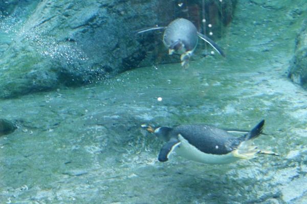 旭山動物園です。ジェンツーが、水中にまかれたオキアミを次々に食べています。旭山のペンギンプールは屋外にあるので水面全体から自然光が入り、水中トンネルに入ればとても明るい水中シーンが観察できます。