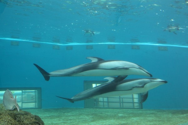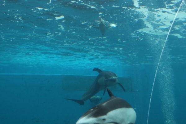 のとじま水族館のフンボルトとカマイルカ。広い水槽でいっしょに泳ぐ姿を撮ろうと思ったのですが、なかなか難しくて。こんなのとか、