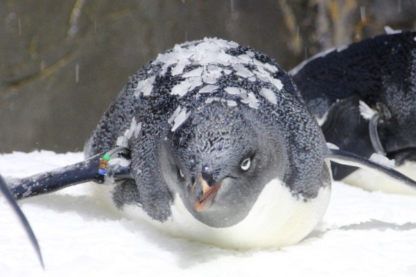 海遊館のアデリー、カキ氷を浴びてニッコリご満悦。