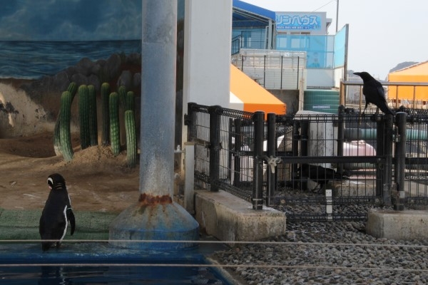 越前松島水族館のフンボルトプールにカラスが来ています。フェンスの上に1羽と、下の方にも1羽。フンボルトの体重は4kg前後、カラスは0.4から0.7kgだそうです。ペンギンは潜水するために身体が頑丈かつ重く、カラスは飛ぶために軽くできています。鳥の骨は空洞なのが一般的ですが、ペンギンの骨は中が詰まっています。