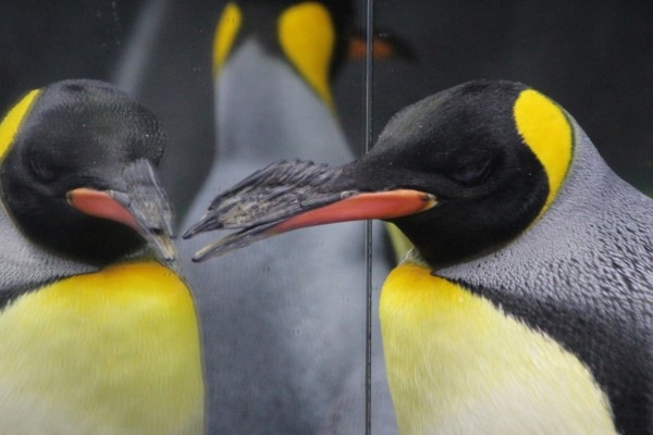 「これでどうじゃ?」と鏡の前でポーズを決める、同じ日のサン君。まるで別ペンギン、元気そうなお姿に戻っています。一泳ぎしてスッキリしたのかも。クチバシの肥大はご老体ペンギンにはよく見られることで、特にイワトビやマカロニで目立つように思います。