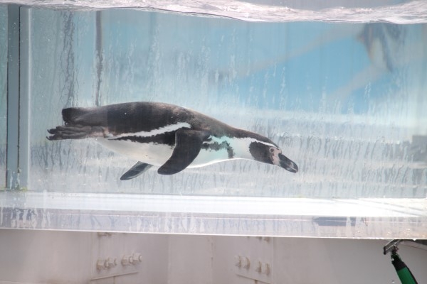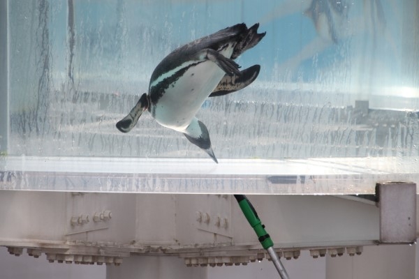 越前松島水族館のペンギン空中プールでお掃除道具を発見! 現場に急行するフンボルト。写真右下に、プール底の裏面を掃除している道具が見えます。
