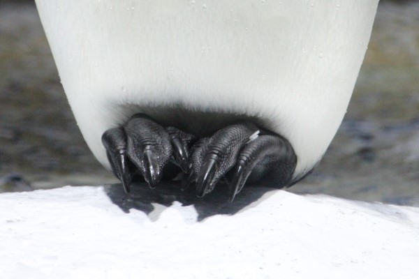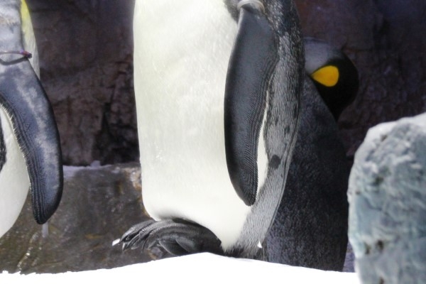 横から見ると、『かかと』で立っているのがハッキリわかります。接地面積を小さくして熱を逃さないためと考えられているそうです。モデルは海遊館のキング。