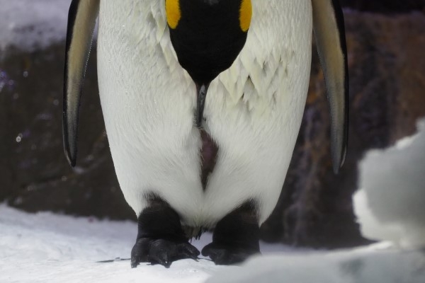 海遊館のキング、白いハラがパックリと開いて地肌が見えている? わりと黒っぽいお肌です。普段は見えませんが、この地肌部分は抱卵嚢と呼ばれ、タマゴをここにフィットさせて体温を効果的に伝えるところですって。キングは足の上にタマゴをおき、前かがみになって抱卵嚢でタマゴを包み込んでいるのですね。