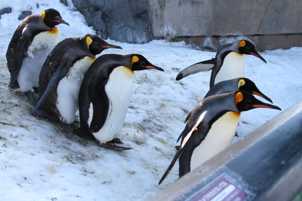 旭山動物園冬の名物ペンギン散歩に出かけるキングたち。雪が多かったので、放飼場は圧雪スロープになっていました。慎重に進む換羽中の3羽がいい味出してます。