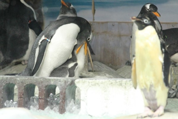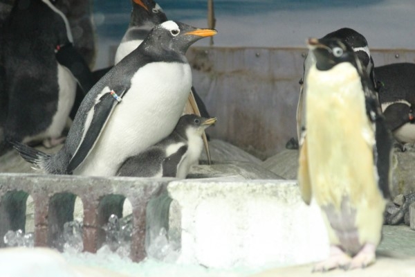 「こわっ、コドモ喰うとるがや」と怖がっているわけではない手前のアデリー。名古屋港水族館のジェンツー親子、ヒナのお食事タイムです。