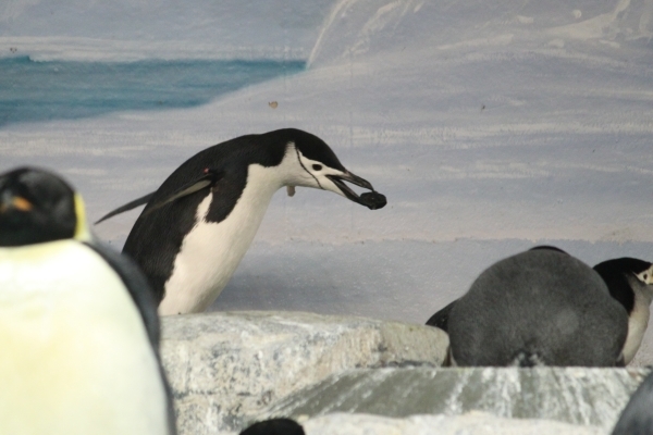名古屋港のヒゲペン、巣の補強に使う小石をどこからか運んできました。巣で抱卵している相方は、奧の壁ぎわにいる横向き個体です。