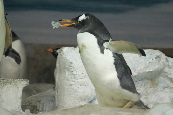 同じく名古屋港水族館のジェンツー、巣材を運んでいるところですが、これは何? 支給される巣材はつるんとした小石なのです。こんなギザギザの石が混じっていたのでしょうか?