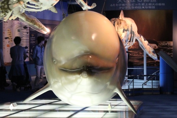 ラブリーなシロイルカが、こんな凶悪そうなお顔の模型に。名古屋港水族館の展示。