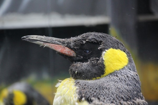 換羽中のペンギンは、古い羽が浮いてボロボロになっています。換羽中は泳がないので、ヨゴレもつき放題。ですが、年に1度の換羽は元気の印。この越前キングもお顔は新しい羽が見え始めました。こんなキングを見かけたら、そっと応援してあげましょう。