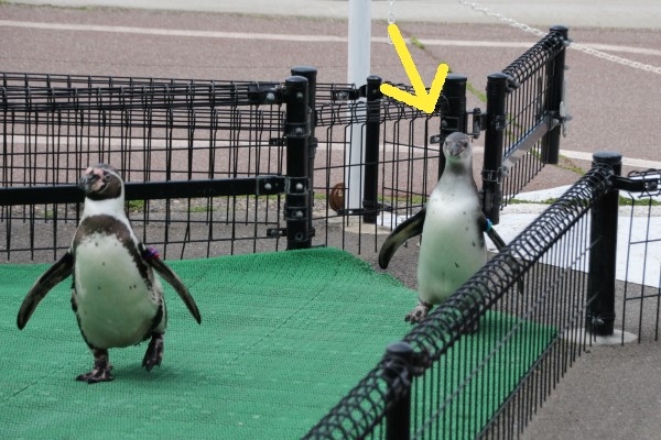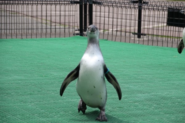 走り回った勢いで、「かえるよ~!」 もしもし、他の仲間は今到着したところですよ。お散歩にまだ慣れていない亜成鳥でした。越前松島水族館のペンギン散歩は、出場メンバーが決まっていません。その時のコンディションで選抜しているそうです。
