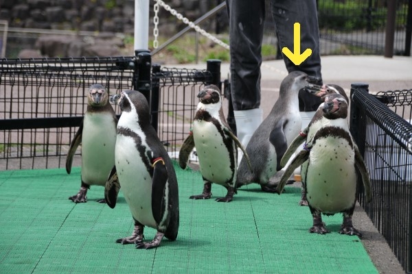 お散歩広場に先頭集団として到着したフンボルト亜成鳥。途中から走ってきたのです。