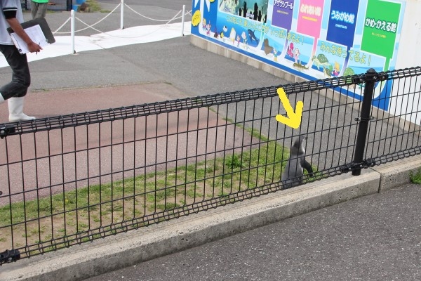 お散歩終了で広場から戻ります。が、フンボルト亜成鳥、勝手な行動に出ました。直ちに飼育員さん急行! ここ、行き止まりですけどね。