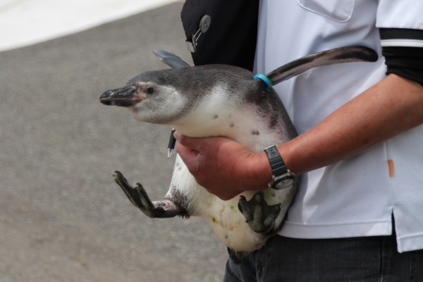 あっけなくつかまった亜成鳥。足とフリッパーをジタバタ、ラブリーです。けど、ホッペを四角く膨らませるのはお怒りのサイン。普通は相手に向けてやるんですけど。越前松島水族館でした。