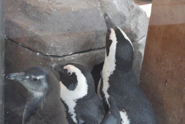 京都水族館のケープ一家、ヒナが親と同じくらいのサイズに育った春先の様子です。ヒナは半分くらい幼綿羽が抜け落ち、亜成鳥に変身中。目の斜め後ろに白いラインが入るのがケープ亜成鳥の目印。お母さんの肩にフリッパーを添えるお父さんがいいですね。