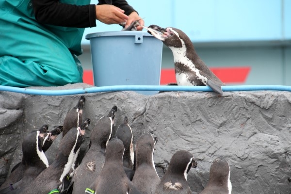 南知多のペンギンお食事タイム。フンボルトが盛り上がるようにして見つめる先は、特別に食べさせてもらう仲間。薬の投与とか体調とか何か理由があるのですが、彼らにはサカナしか見えてないですから。