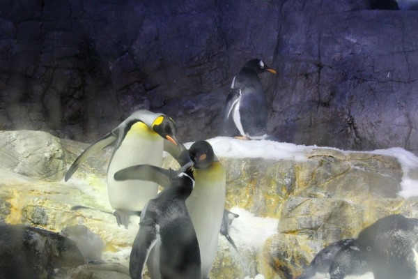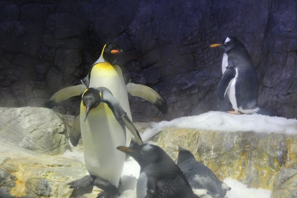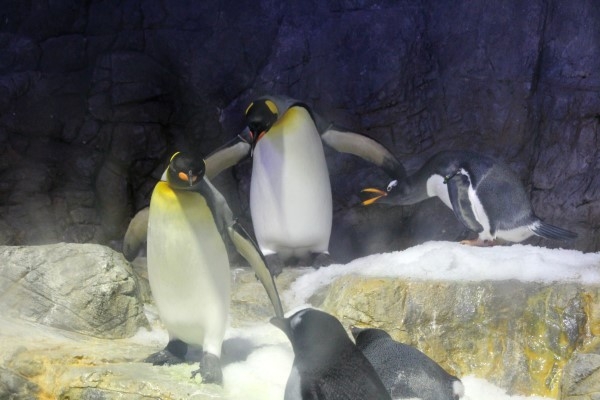 やっぱりここでも。「なんなん?もう!」「そない怒らんかて」くらいの、軽い小競り合い。それ以上の争いには発展しないのが普通です。案外、同じ種どうしのほうが深刻な争いになったりするようです。このキングたちも、じゅうぶん退屈しのぎになったことでしょう。海遊館でした。