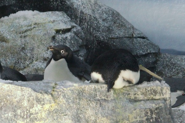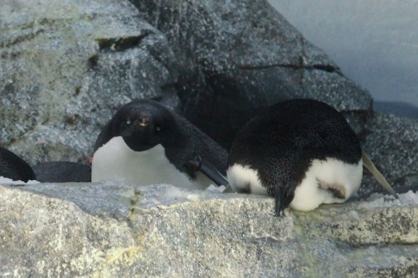 名古屋港水族館のアデリー、2羽なかよくお昼寝中。目を閉じていても白いアイリングがあるので、『ちっちゃな目』に見えちゃいます。