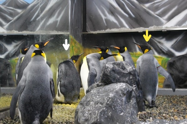 越前松島水族館で抱卵中のキング、カレ君(白矢印)に近づこうとするも、その他個体に阻まれるカノジョさん(黄矢印)。ベテランの個体なら邪魔者をかき分け小競り合いしつつ通り抜けるのですが、若いからか気が弱いのか、ブロックされっぱなしです。つづく。