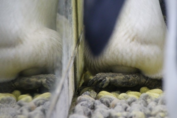 さて、こちらは鏡前でひたすらタマゴを温めるカレシ君です。足の上に置いたタマゴが、ハラの羽毛の下にチラ見え。(手前の場所取りペアのフリッパーが写っちゃってます)。カノジョさん、ここにたどり着けるのでしょうか?越前松島水族館の抱卵・場所取り、次回がラスト!