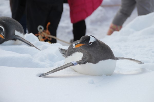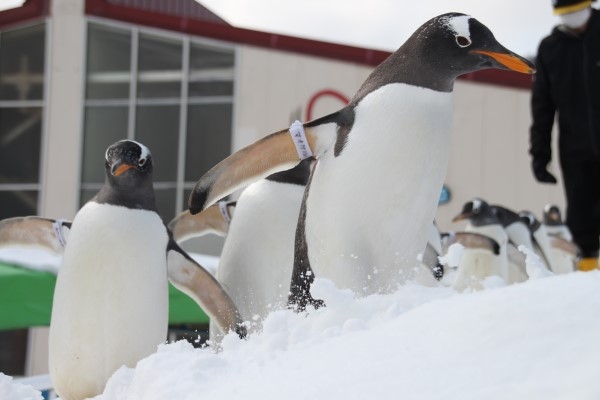 おたる水族館、冬はジェンツーのお散歩が絶好調です。扉が開くのを待ち構えていた集団が飛び出してきます。