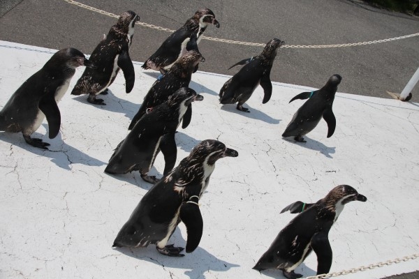 越前松島水族館のペンギン散歩。白いペンギン道を歩くフンボルト、それぞれペンギンらしい形の影をお供にしています。私はペンギン形の影を撮るのが好きですが、