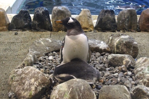 アドベンチャーワールドのジェンツー親子です。さて、ヒナはどっち向きでお昼寝しているかな?
