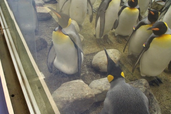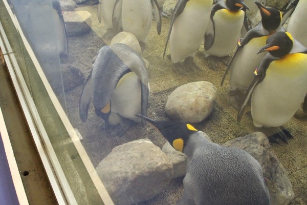 アドベンチャーワールドのキング、窓際のA席列です。いったん外に出したタマゴをハラの下に収納するところです。クチバシで足の前に引き寄せ、