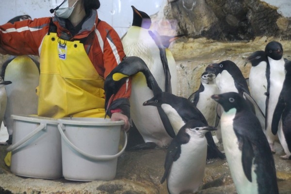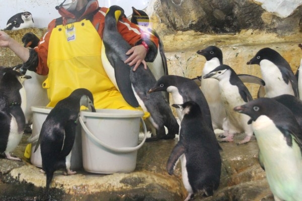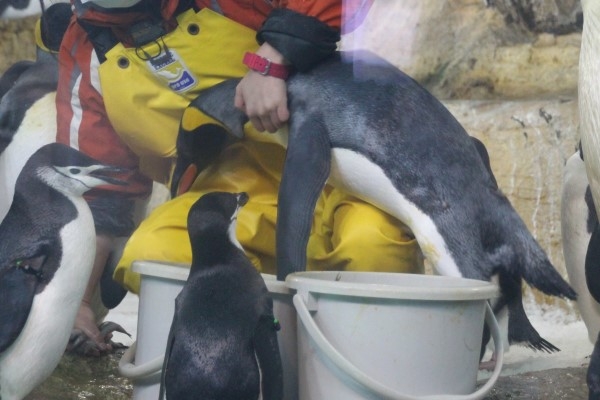 アドベンチャーワールド海獣館でのフィーディングタイム。1羽のキングが飼育員さんにすり寄っています。バケツのサカナをセルフで頂戴するつもり?