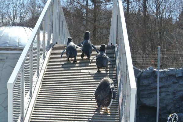 旭山動物園、スロープを降りてくるフンボルト3羽を単独迎え撃つジェンツー、みたいな構図ですが。