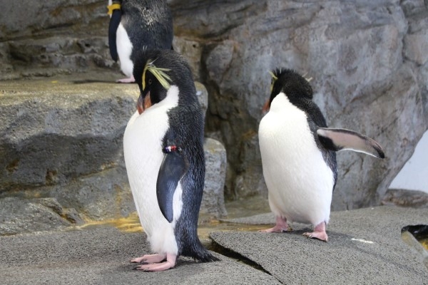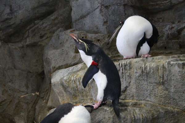 ですが、小さな種類のペンギンだって、同じようによく曲がります。海遊館のイワトビ。首が曲がるというより、体全体がむっちりと曲がっています(上)。伸びている姿(中)と比べてみてください。