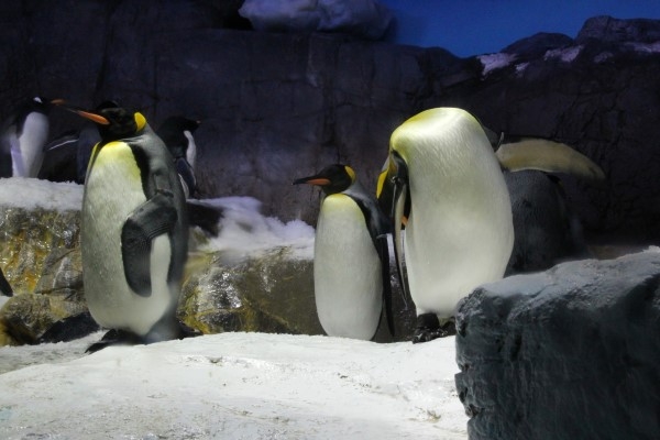ペンギンの首がのびる、曲がる、などの様子はたいていキングの写真で紹介してきました。こちらは海遊館のキングです。 (ほんとうにクッキリ首が曲がっていますね。そして左側のキング、フリッパーの関節もよく曲がっています。)