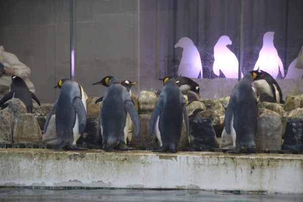 アドベンチャーワールドのペンギン王国2Fには、いろんなペンギン装飾があります。これはある年の作品。写真奥に見えているペンギンシルエットの電飾パネル、モデルはキングではないようですが、手前のキングたちと比べても、ペンギンの形をリアルに現していることがわかります。