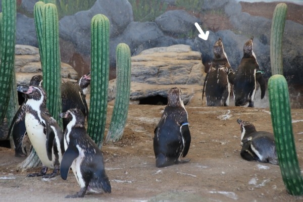 越前松島水族館です。フンボルトの背中に顔が見えたら、夏の疲れかも。矢印の個体、換羽を前に古い羽がボサボサになってきたのが模様、モダンアートな顔の模様に見えます。