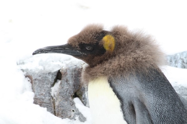 旭山のキングひな、春先の換羽で亜成鳥に変身中! 残る幼綿羽はあと少し。前回写真でお母さんよりも大きかったモコフワの中身はこれだったんです。