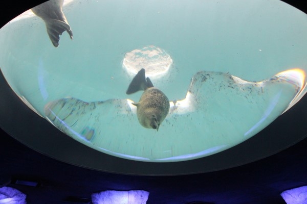 海遊館のワモンアザラシプールには、下から見られる逆ドーム型の窓があります。窓の上には、穴の開いた擬氷が浮かんでいるので、穴を通って降りてくるアザラシが見られるのです。このアザラシ、尾びれのように見えるものは、足です。指を広げるとこうなります。
