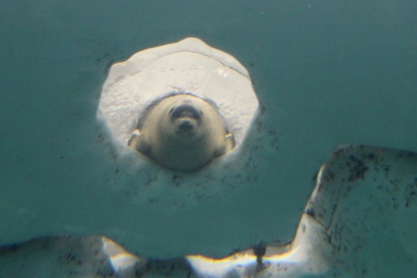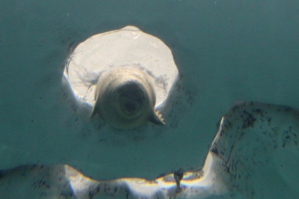 次のアザラシが、擬氷の穴からにっこり顔を見せました。アザラシの周囲に見えているのは水面です。