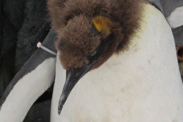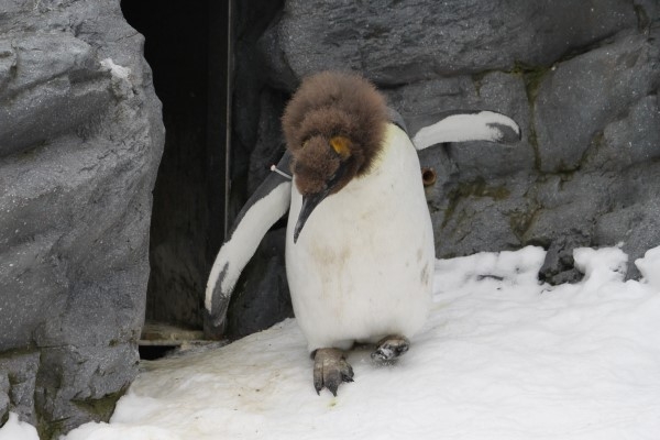 前回写真で段差を上っていた旭山の若王様、残っている幼綿羽がまるで『かぶりもの』みたいでコミカルです。雪が凍って滑る斜面を慎重に歩く図。足が身体の外側により気味なのも、なり立て亜成鳥の特徴です。