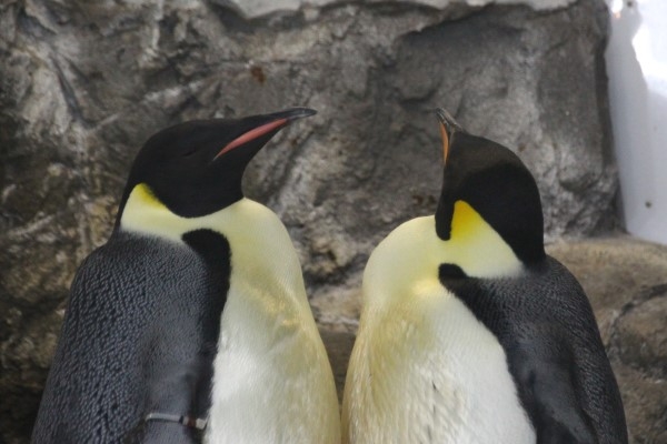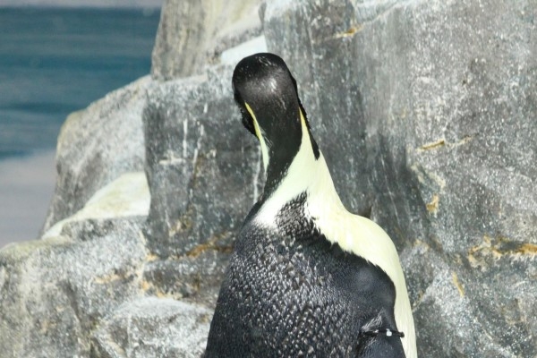 名古屋港水族館のエンペラー、首を伸ばして回し、羽づくろい中。伸びた模様がすごいですが、