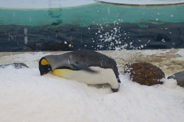 アドベンチャーワールドのキング、カキ氷の山で大暴れ! カキ氷をダイナミックに跳ね飛ばします。