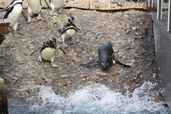 マゼランペンギンがバッタリところびました。プール目指してスロープをかけおりていて、勢いがつきすぎたのでしょう。ただし、こんなふうに正面から見ると急峻な坂に見えますが、じっさいはそんなにきつくありません。上越市水族博物館うみがたり。