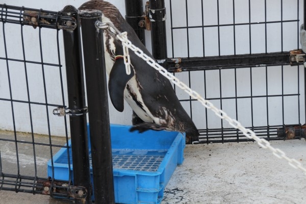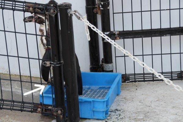越前松島水族館のフンボルトのお散歩、帰宅時には消毒液に足を浸すことになってます。順番に1羽ずついきます。距離を見極めて、