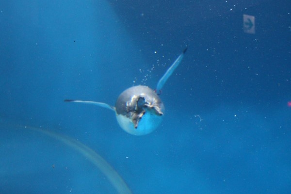 後ろから見てもまん丸。どのペンギンでも同じような姿で泳ぐのですが、ジェンツーは特に水の抵抗が少ないフォルムなのだそうです。モデルは越前松島水族館のジェンツー。