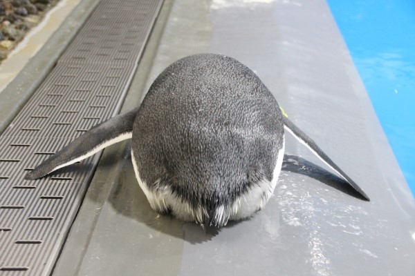 さて、この後ろ姿は何ペンギンでしょう? 越前松島水族館のペンギン館プールサイドでおくつろぎ中です。