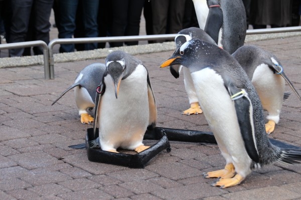 お散歩の広場で散水ホースを取り調べる登別のジェンツーたち。ホースに取り巻かれた格好の亜成鳥、困っているのではなくて、どうしてやろうかと考えているのだと思います。