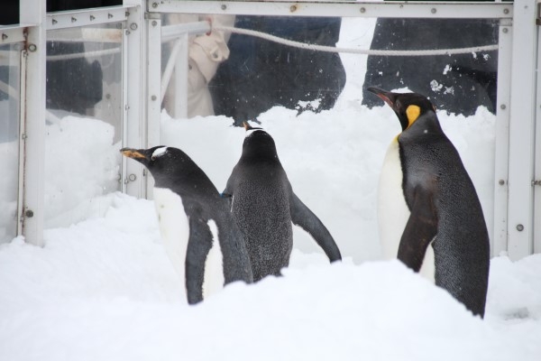 アクリル越しに人間を眺めるジェンツーとキング。「ほーぉ」といいつつ観察しているような姿です。旭山動物園。このキング亜成鳥は、ずっとジェンツーといっしょに行動していました。オトナたちには遊んでもらえないからでしょうか。