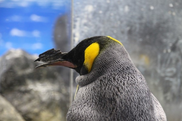 越前松島水族館のサン君は、たいへん高齢なキングです。歳のせいか、お肌にたるみが出ています。上クチバシには、マカロニペンギン属のご老体によく見られるようなゴツゴツとした出っ張りが。食べるのには支障ありませんので、ご安心を。孫も1羽(お嫁に行きました)。充実のおじいちゃん、まだまだ元気です。