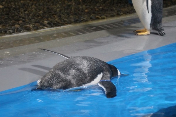 越前松島水族館のジェンツー、プールの浅瀬にバッタリと倒れている!? でもご安心ください。遊んでいるらしいです。御子様水泳の『面かぶり』のように顔を水に伏せて、しばらくすると顔を上げプハーッと息をする、というのを繰り返していました。